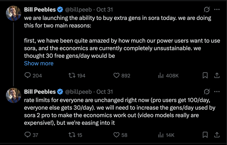 1. The Economics are “Completely Unsustainable” It turns out, people love Sora. Peebles admitted the team was “amazed” by how much power users were using the tool. They thought 30 free generations a day would be more than enough, but creators quickly proved them wrong.